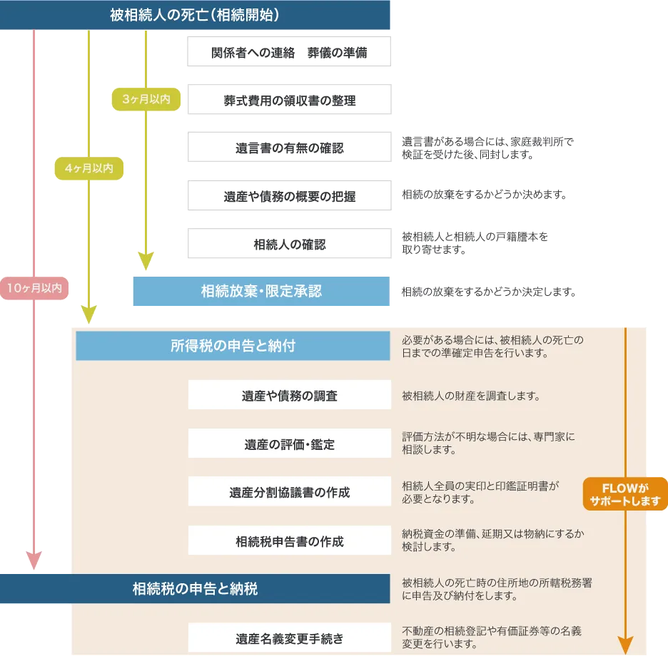 - 財産評価から準確定申告、遺産分割協議書の作成、相続税申告書の作成、税務署への提出までFLOWがサポート可能です。